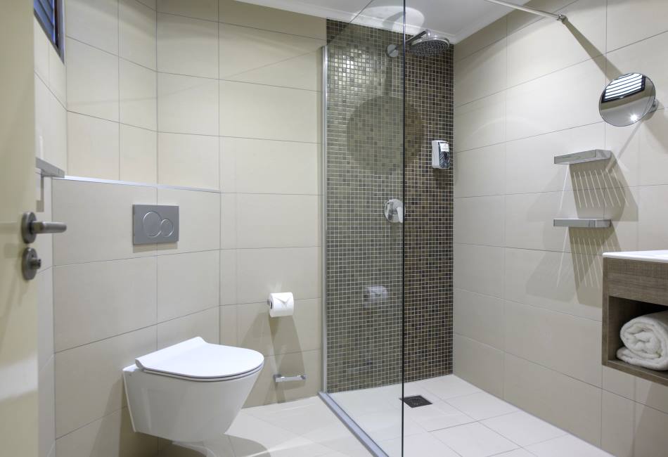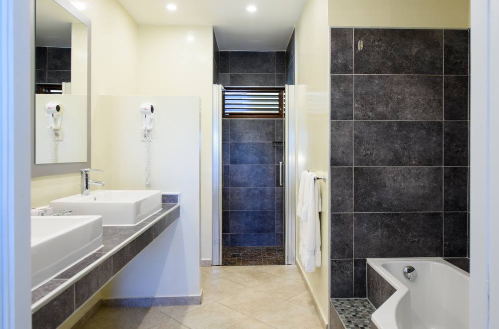 Very spacious bathroom with bathtub, rain shower, and private gym.