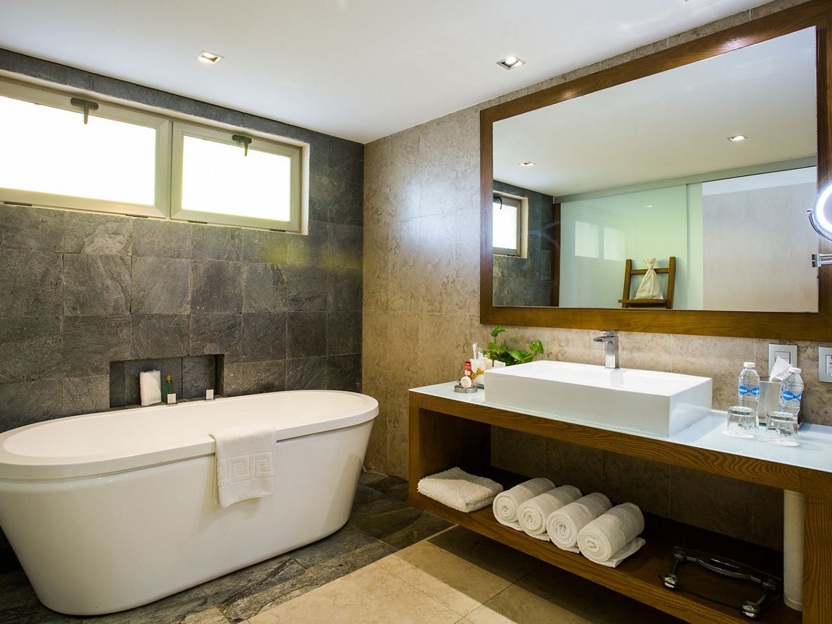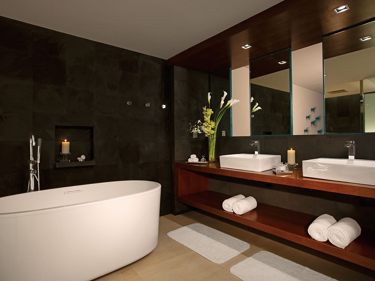- Bathroom with single or double sinks with a separate walk-in shower and bath